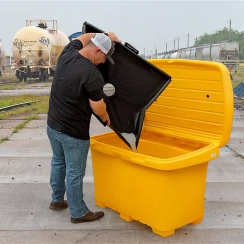 The Ultra-Pellet Collection Box is a heavy-duty, weather-resistant, lockable polyethylene (LLDPE) bin designed to store plastic pellets collected from sites where they are not otherwise contained. It is easily transported with a forklift or pallet jack.